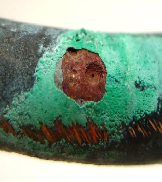 Figuur 2: Typerend schadebeeld in een doorsnede, bestaande uit een corrosieput die is bedekt met corrosieproduct waarbij een 'geperforeerd membraan' van afwijkend corrosieproduct de corrosieput afsluit. In dit geval had de corrosie op de onderzochte locatie nog niet tot perforatie geleid.